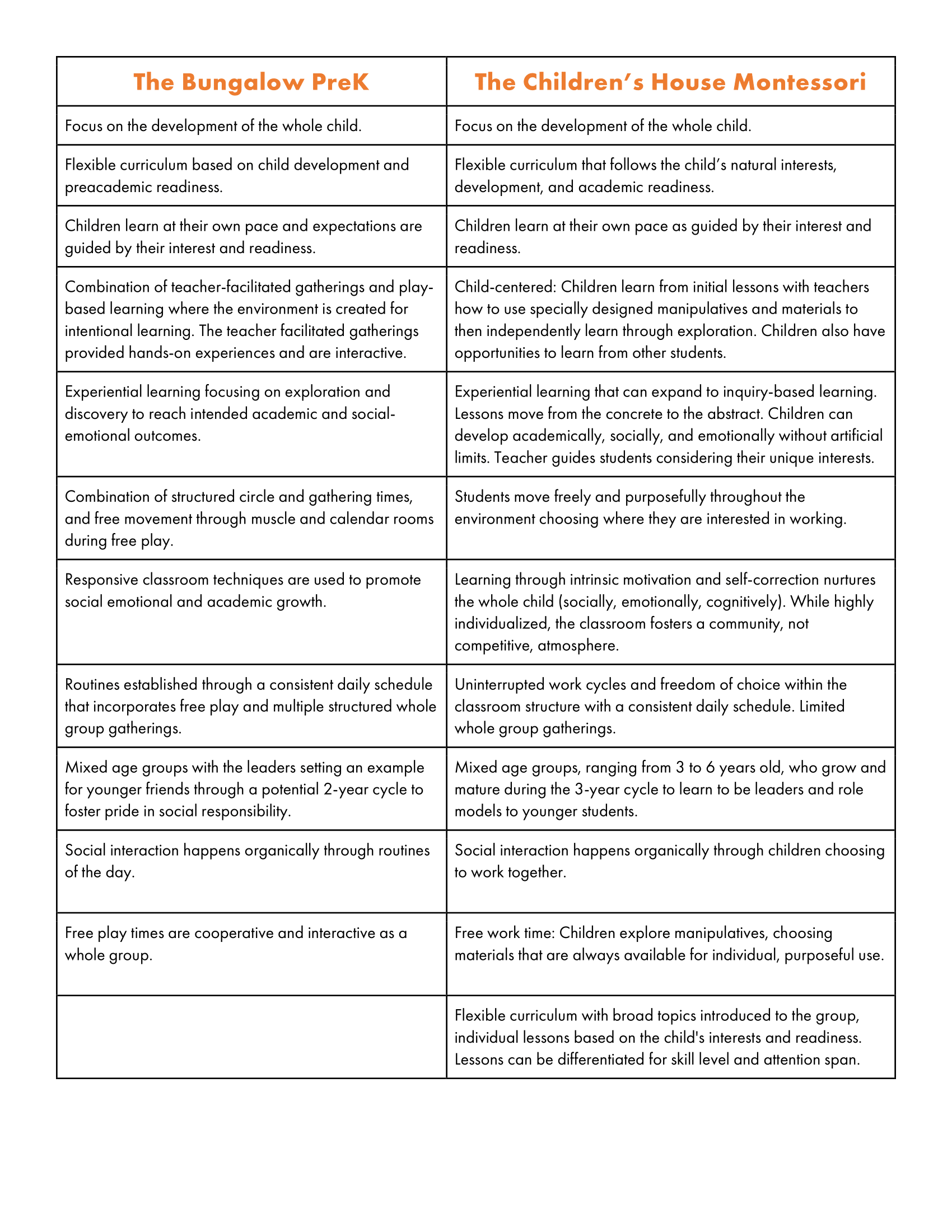 The chart below compares Park's PreK program with Park's Montessori program. We encourage you to read the information below then schedule a tour to see the campus, The Bungalow, and The Children’s House to learn more about our Early Education Programs and determine the best fit for your child. Please contact admissions@theparkschool.org or 716.839.1243 x107.