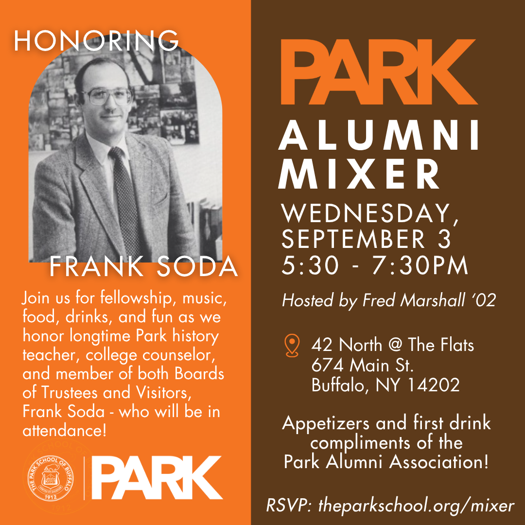 Alumni Mixers are back! Next on the alumni calendar is our Back to School Alumni Mixer, now set for 42 North in the Flats in downtown Buffalo on Wednesday, September 3 from 5:30-7:30pm hosted by original 42 North taproom manager Fred Marshall ‘02, and this time honoring longtime Park history teacher, college counselor, and member of both Boards of Trustees and Visitors, Frank Soda!